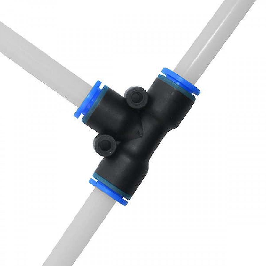 Conector rapid tip T - seria Blue confectionat din plastic de inalta calitate si alama nichelata. Se pot conecta furtunuri de 8 mm diametru exterior pentru legarea pompei de vid sau diverselor conectiuni. Se poate utiliza la presiuni de maxim 15 bar.