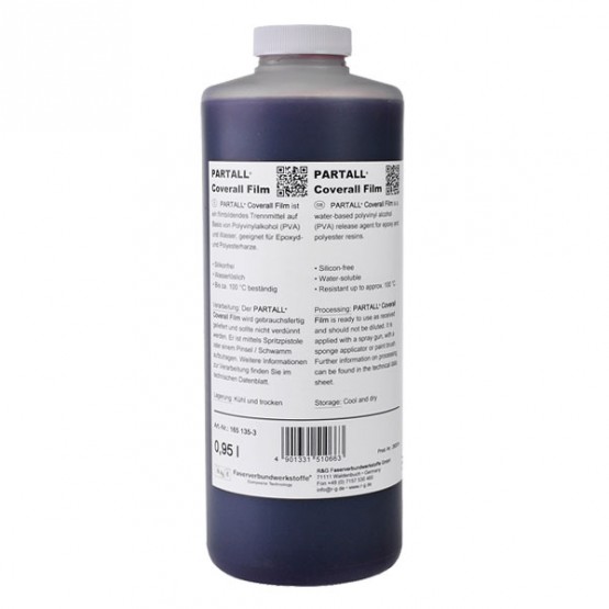 PARTALL ® Coverall Film este un agent de separare peliculă pe bază de alcool polivinilic (PVA) și apă. Nu se contractă și prin urmare se poate utiliza cu succes pe suprafetele curbate. Este usor biodegradabil si nu este o substanta periculoasa conform reglementarilor actuale de securitate si transport. Este compatibil cu rasina epoxilica si materiale pe baza de poliester.