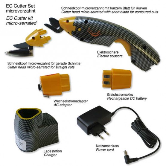 EC-Cutter este o foarfeca electrica pentru taierea materialelor textile din carbon, Kevlar, etc. EC-Cutter are doua capete de taiere, cu lama scurta pentru contur si cu lama pentru taieturi drepte, acumulator reincarcabil, incarcator si cablu de alimentare. Calitatea materialelor folosite, dimensiunea redusa, forma ergononica si timpul de taiere redus fac din EC-Cutter cea mai buna solutie pentru pregatirea materialelor textile compozite..